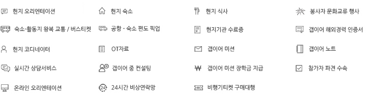 - 현지 기관 도착 후 본격적인 프로젝트 시작 전, 매주 화요일에는 오리엔테이션 및 사전교육이 진행됩니다. 오리엔테이션 참가를 위하여 전날인 월요일에 공항 픽업을 제공하고 있습니다.