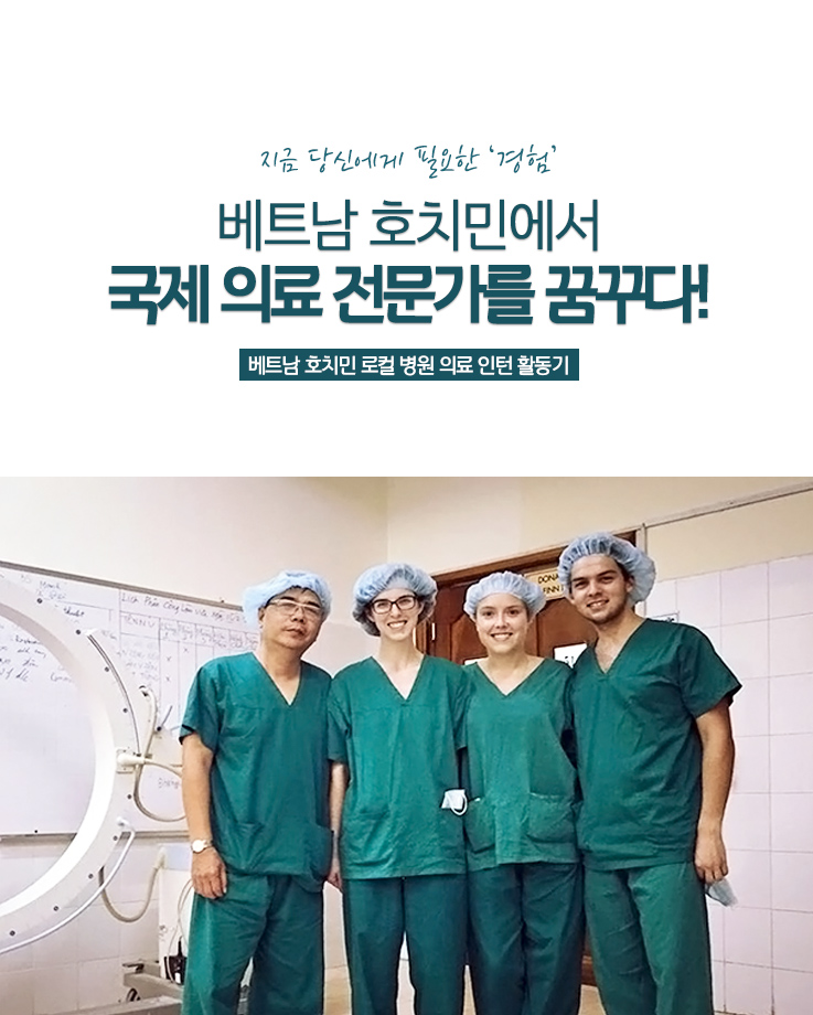 베트남 호치민 로컬 병원의 의료 인턴으로 활동하며, 환자들을 만나 실제 의료 환경을 경험해보는 프로젝트입니다. 로컬 의료진들의 지도 아래 진행되기 때문에 안전한 환경에서 이루어지며 다양한 국적의 의료 전공생들과도 교류해 볼 수 있습니다. 개발도상국인 베트남의 성장하고 있는 실제 의료 시스템을 직접 경험할 수 있을 뿐만 아니라, 한국과의 차이점을 직접 경험하며 깊은 이해와 통찰을 얻을 수 있습니다.