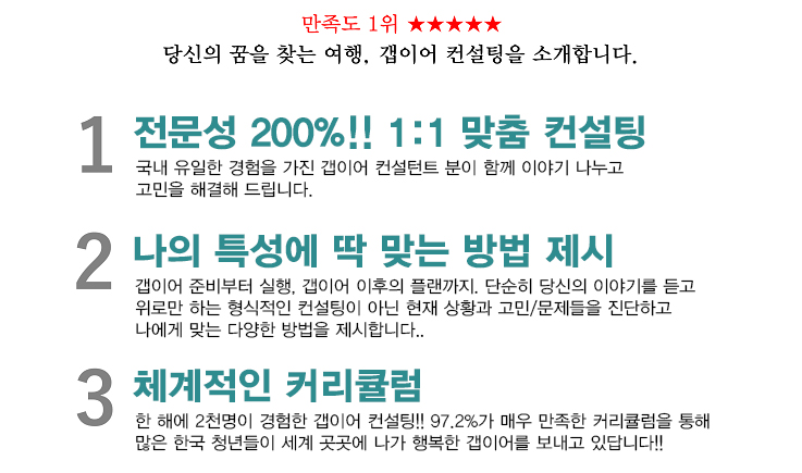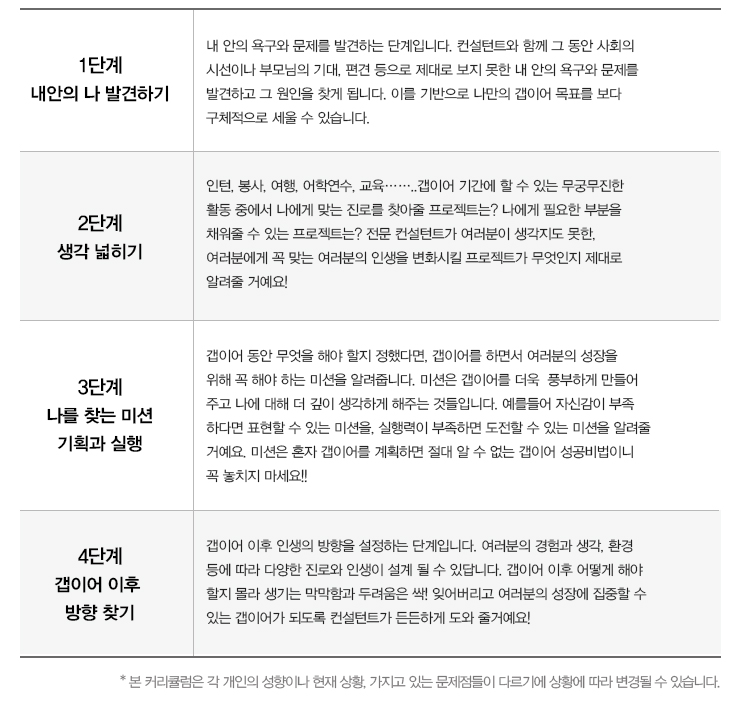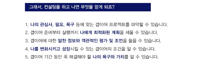■ 참고해주세요! - 담당 컨설턴트 분과 1:1로 한국갭이어 상담실에서 진행이 됩니다. - 참가자의 정확한 컨설팅을 위해 컨설턴트분들도 가장 권장하는 컨설팅 방식입니다. |