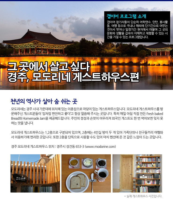 모도리네는 경주 시내 가운데에 위치해 있는 이층집으로 마당이 있는 게스트하우스입니다. 모도리네 게스트하우스를 방문해주신 게스트분들이 ‘집처럼 편안하고 좋다’고 항상 말씀해 주시는 곳입니다. 특히 매일 아침 직접 만든 Fresh baked Bread와 Homemade Jam을 제공해드립니다. 주인의 정성과 손맛이 어우러져 외국인 게스트도 한번 먹어보면 잊지 못 하는 맛을 냅니다. 모도리네 게스트하우스는 1,2층으로 구분되어 있으며, 2층에는 4인실 방이 두 개 있어 가족단위나 친구들끼리 여행와서 이용하기에 편리한 곳입니다. 또한 2층을 단독으로 사용할 수도 있어 마치 펜션에 온 것 같은 느낌이 드는 곳입니다. 경주 모도리네 게스트하우스 위치 : 경주시 성건동 653-3 (www.modorine.com)