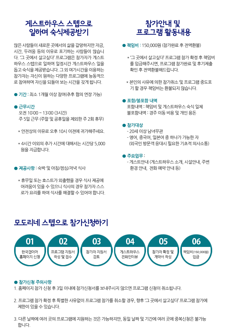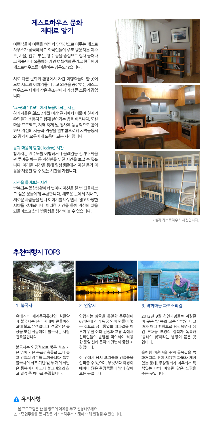 1. 본 프로그램은 한 달 정도의 여유를 두고 신청해주세요. 2. 스텝업무활동 및 시간은 게스트하우스 사정에 의해 변경될 수 있습니다.