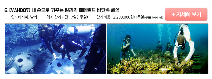 노을 지는 붉은 저녁과, 파란 바다가 공존하는 발리! 푸른 바다 속에서 형형색색의 열대어들과 함께 노는 기분, 상상만 해도 짜릿하죠? 세계 곳곳에서 온 뜻있는 다이버들과 함께 발리에서 낭만적인 휴가를 즐기며 해양 생태계를 보존하세요. 산호초를 심는 일부터 물고기 종류 조사, 바닷 속 쓰레기를 청소하 는일까지, 환상적인 에메랄드 바닷 빛이 여러분의 손을 통해 만들어 집니다. 발리 북부의 한 평화로운 섬에서 현지 주민들과 함께 멸종 되어가는 산호섬을 되살리는 의미있는 활동에 앞장 서 보세요!