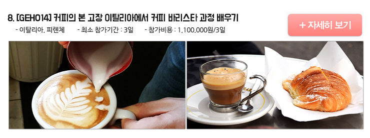 이탈리아는 에스프레소 커피의 본고장 답게 하루 세번 커피타임을 즐길 정도로 커피를 많이 마십니다. 이탈리아 사람들은 커피를 다양하게 먹고자 에스프레소, 카푸치노, 카페오레 등 다양한 방법으로 즐기기 시작하였고, 여러나라로 전파되기 시작하였습니다. 본 프로젝트는 이탈리아 피렌체 도시에서 커피 바리스타 교육과정을 배울 수 있는 프로젝트입니다. 이탈리아의 커피는 커피 향과 강한 맛의 커피를 만들기 때문에 이탈리아 전통방식의 커피를 추출하는 법, 카푸치노와 카페라떼와 같이 우유가 향유된 커피들의 우유거품을 내는 방식 등의 커피 제조법을 전문적으로 배울 수 있습니다.