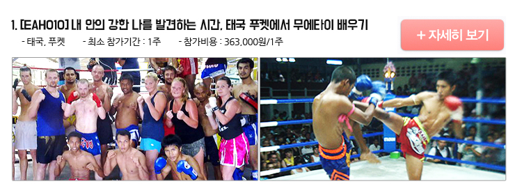 무에타이는 태국의 전통 무술이자 격투 스포츠로 1000년 가량 이어져왔습니다. 무에타이는 가능한 모든 신체부위를 사용하는 무술이므로, 복싱보다는 펀치와 스텝의 빈도가 낮으며 신체의 균형 유지에 좀 더 신경을 써야 하는 운동입니다. 한국에서는 최근 다이어트 열풍이 불면서 무에타이의 다양한 동작을 활용한 다이어트가 큰 인기를 얻고 있습니다. 다이어트 및 군살제거와 스트레스 완화, 호신 효과를 동시에 누릴 수 있는 전신 유산소운동인 무에타이! 태국 푸켓의 푸른 해변을 즐기며 유명한 선수 출신 트레이너로부터 집중적으로 훈련을 받을 수 있는 기회, 내 안의 강한 모습을 발견하고 심신을 수련할 수 있는 기회를 놓치지 마세요!