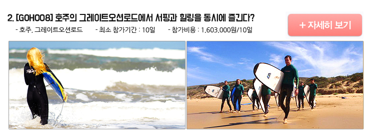 호주에 가면 꼭 경험해야 하는 것 중 단연 1위, 서핑! 호주는 세계 최고의 서핑 대회, 립 컬 프로(Rip Curl Pro)의 개최지이자 전세계 서퍼들이 한번쯤은 서핑을 하고 싶어하는 곳으로 뽑히는 곳입니다. 또한 그레이트오션로드에는 서핑의 천국이라 불리는 벨스비치(Bells Beach) 등 서핑을 하기에 최적의 파도조건을 갖춘 수많은 비치가 존재합니다. 이 곳에서 총 10일 동안 서핑을 배우고 즐길 수 있으며, 그레이트 오션 로드도 여행할 수 있는 기회! 총 10일 중 여러분에게 주어지는 하루의 힐링타임은 일상에서 받은 스트레스를 날려버릴 수 있는 인생 최고의 시간이 될 것입니다.