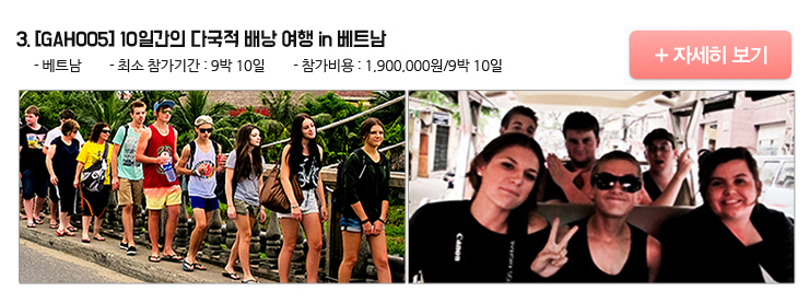 다양한 국가에서 온 외국인 친구들과 함께 10일간 베트남 전국을 누비는 자유로운 여행! 당신에게 주어진 꿀 같은 휴가를 위한 최고의 선택이 될 것입니다. 본 프로젝트는 9박 10일의 일정 동안 베트남의 핵심 도시인 하노이, 하롱베이, 후에, 호이안, 호치민 시를 모두 여행할 수 있으며 세계 각지에서 모인 다국적 친구들과 함께 자유로운 분위기에서 휴가를 즐길 수 있는 프로젝트입니다.