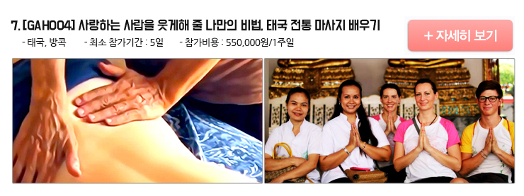 사랑하는 사람에게 나만의 마사지법을 전수해 주세요! OECD 국가 중 근로 시간이 가장 길다는 한국 사회에 살고 있는 많은 사람들은 누적되는 피로에 힘들어 합니다. 퇴근 길 지하철을 타면, 하루 종일 정신적, 육체적 노동을 견뎌내고 축 쳐진 어깨로 집으로 돌아가는 직장인들을 만날 수 있습니다. 이러한 사람들은 바로 나 자신이거나 부모님이나 배우자, 친구들과 같은 바로 우리 옆에 있는 사람들입니다. 태국 전통 마사지요법을 짧지만 집중적으로 배우고 한국으로 돌아와 사랑하는 사람들에게도 내가 배운 마사지법을 전달해주세요.
