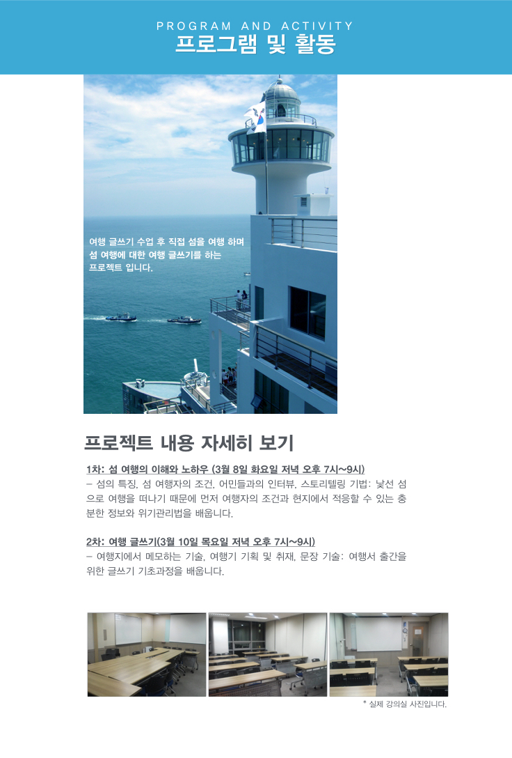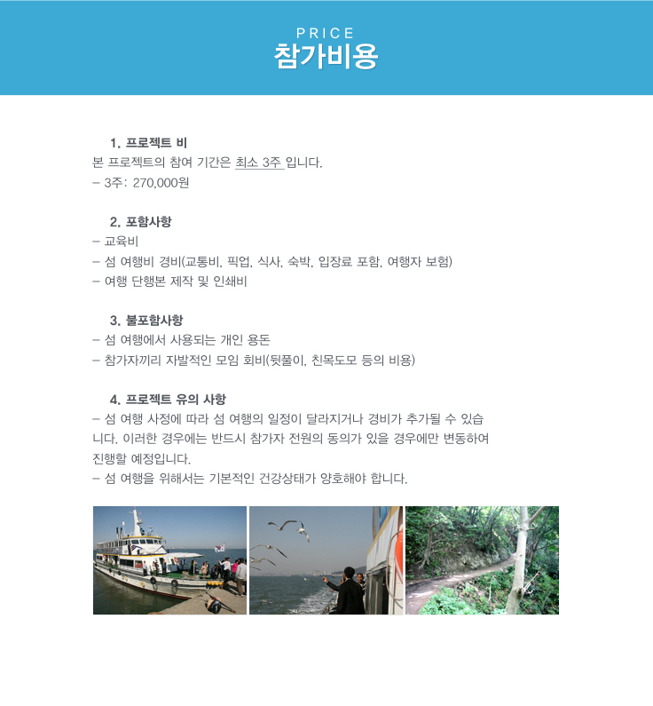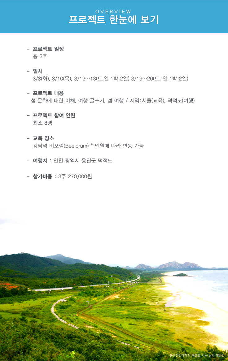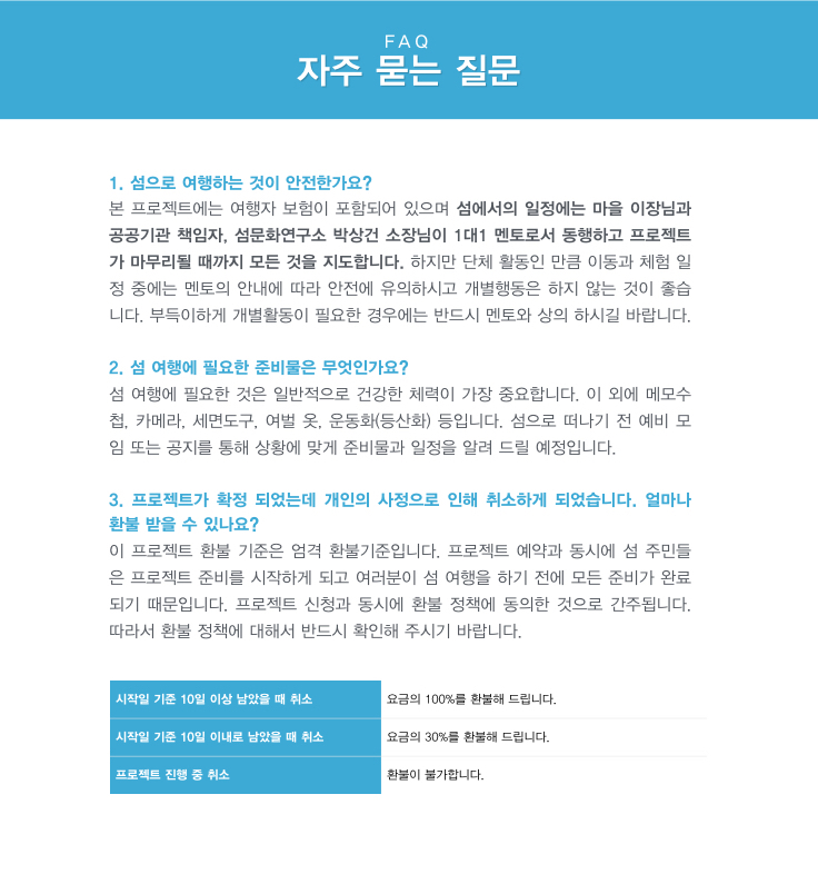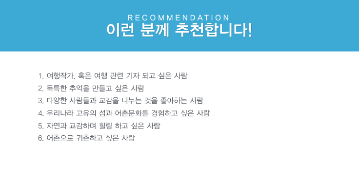 섬과 어촌으로 여행을 떠나면 힐링을 맛볼 수 있습니다. 이 프로젝트에 참여하는 것만으로도 섬마을의 삶과 스토리를 공유하고 알지 못했던 수많은 해양문화에 대해 배울 수 있기 때문에 프로젝트 후 자신감을 충전하고 인생을 바라보는 시야를 넓힐 수 있기를 바랍니다.