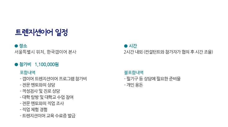 포함내역 - 갭이어 트렌지션이어 프로그램 참가비 - 전문 멘토와의 상담 - 적성검사 및 진로 상담 - 대학 탐방 및 대학교 수업 참여 - 전문 멘토와의 직업 조사 - 직업 체험 경험 - 트렌지션이어 교육 수료증 발급