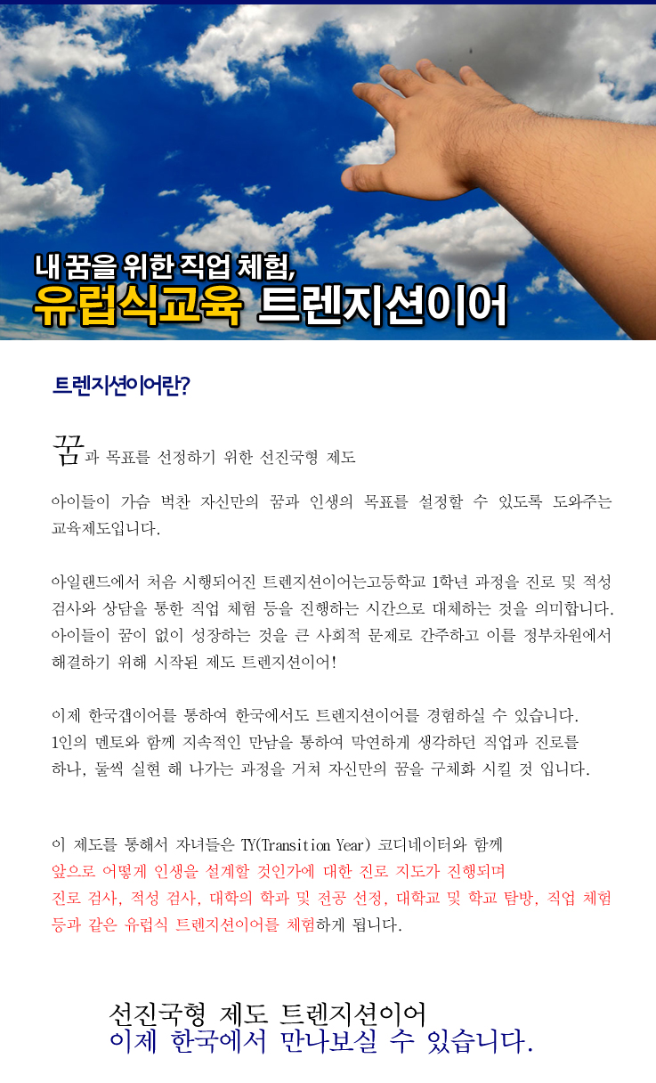 꿈과 목표를 선정하기 위한 선진국형 제도 트렌지션이어는 영국에서 처음 만들어진 갭이어로 아일랜드 방식의 하나입니다. 기존의 아일랜드의 트렌지션이어는 고등학교 1학년을 선택하는 제도로 상담, 진로 지도 및 검사, 직업 체험 등을 진행합니다. 1인의 멘토와 함께 해 학생이 막연하게 생각하던 직업과 진로를 하나, 둘씩 실현 해 나아가는 프로그램입니다. 현재 한국의 사회적 모습과 같이 아이들이 꿈이 없이 성장한다는 것, 이 점이 아일랜드의 큰 사회 문제 중 하나였습니다. 그래서 정부차원에서 시작된 제도가 바로 트렌지션이어입니다. 이 제도를 통해서 자녀들은 TY(Transition Year) 코디네이터와 함께 앞으로 어떻게 인생을 설계할 것인가에 대한 진로 지도가 진행되며 진로 검사, 적성 검사, 대학의 학과 선정, 대학교 및 학교 탐방, 직업 체험 등과 같은 유럽식 트렌지션이어를 체험하게 됩니다. TY코디네이터는 우리 아이들의 멘토가 되어 미래 설계에 있어 든든한 버팀목이 될 것입니다.