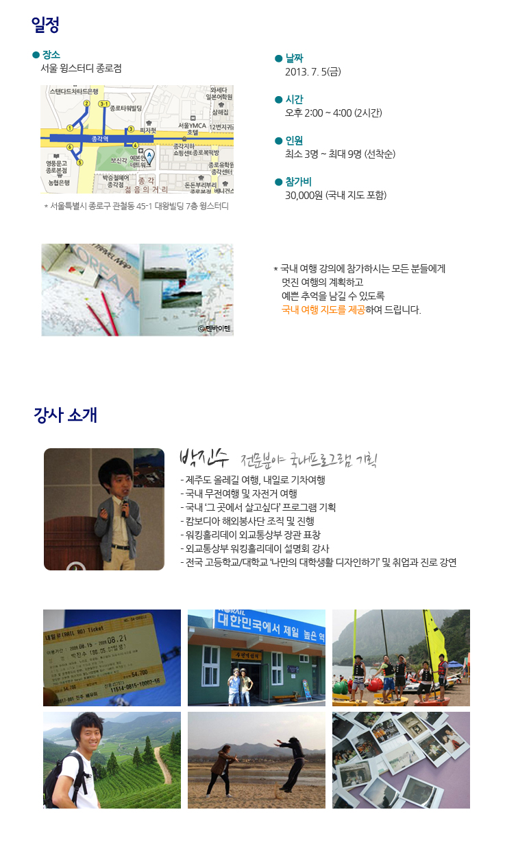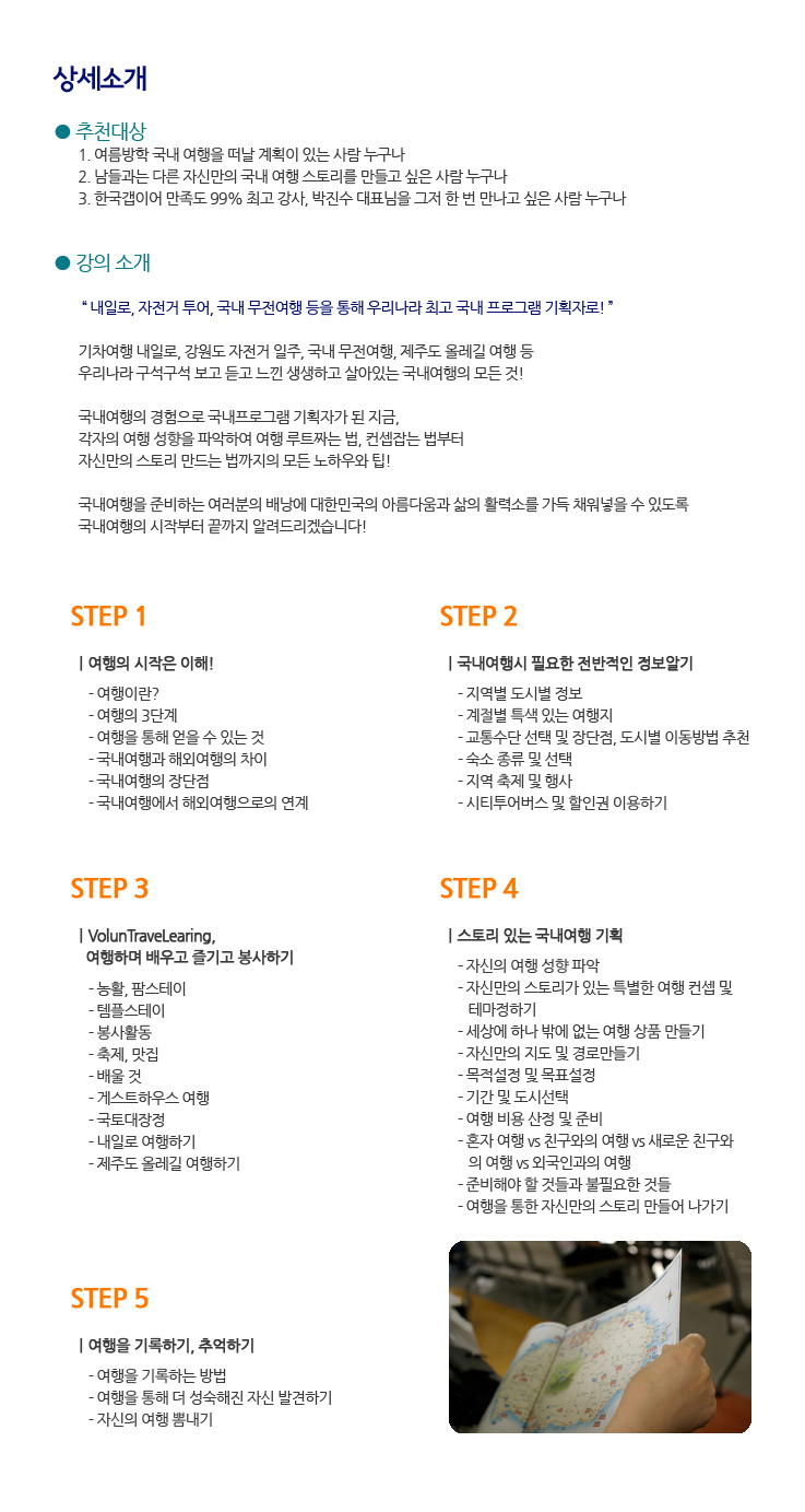 * 국내 여행 강의에 참가하시는 모든 분들에게 멋진 여행의 계획하고 예쁜 추억을 남길 수 있도록 국내 여행 지도를 제공하여 드립니다.