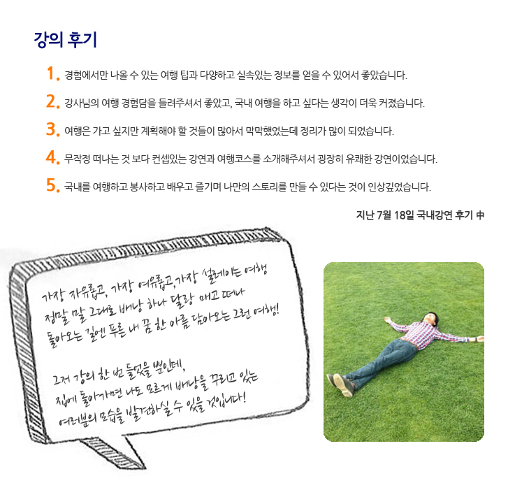1. 경험에서만 나올 수 있는 여행 팁과 다양하고 실속있는 정보를 얻을 수 있어서 좋았습니다. 2. 강사님의 여행 경험담을 들려주셔서 좋았고, 국내 여행을 하고 싶다는 생각이 더욱 커졌습니다. 3. 여행은 가고 싶지만 계획해야 할 것들이 많아서 막막했었는데 정리가 많이 되었습니다. 4. 무작정 떠나는 것 보다 컨셉 있는 강연과 여행코스를 소개해주셔서 굉장히 유쾌한 강연이었습니다. 5. 국내를 여행하고 봉사하고 배우고 즐기며 나만의 스토리를 만들 수 있다는 것이 인상 깊었습니다. 지난 7월 18일 국내강연 후기 中