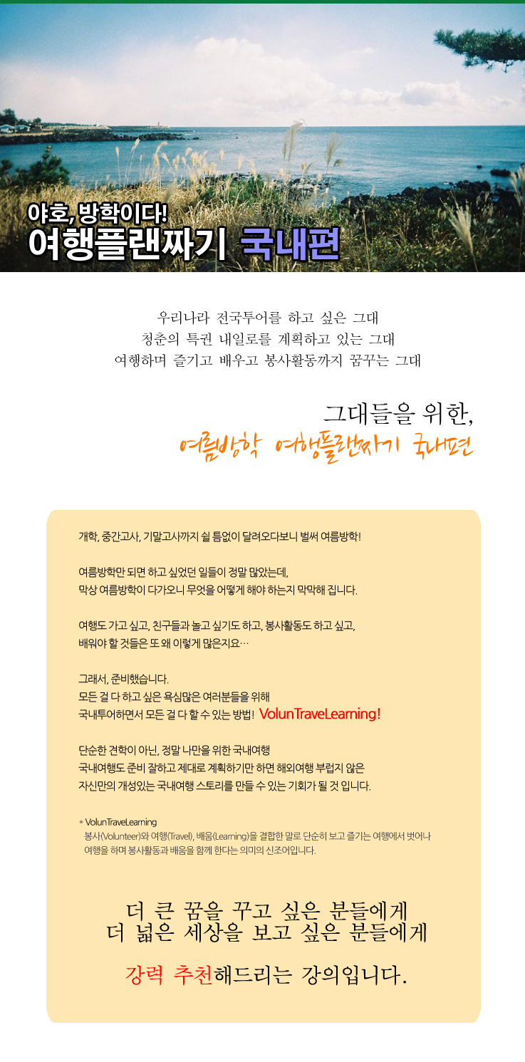 개학, 중간고사, 기말고사까지 쉴 틈 없이 달려오다 보니 벌써 여름방학! 여름방학만 되면 하고 싶었던 일들이 정말 많았는데, 막상 여름방학이 다가오니 무엇을 어떻게 해야 하는지 막막해 집니다. 여행도 가고 싶고, 친구들과 놀고 싶기도 하고, 봉사활동도 하고 싶고, 배워야 할 것들은 또 왜 이렇게 많은지요… 그래서, 준비했습니다. 모든 걸 다 하고 싶은 욕심 많은 여러분들을 위해 국내투어하면서 모든 걸 다 할 수 있는 방법! VolunTraveLearning! 단순한 견학이 아닌, 정말 나만을 위한 국내여행 국내여행도 준비 잘하고 제대로 계획하기만 하면 해외여행 부럽지 않은 자신만의 개성있는 국내여행 스토리를 만들 수 있는 기회가 될 것 입니다. * VolunTraveLearning 봉사(Volunteer)와 여행(Travel), 배움(Learning)을 결합한 말로 단순히 보고 즐기는 여행에서 벗어나 여행을 하며 봉사활동과 배움을 함께 한다는 의미의 신조어입니다.