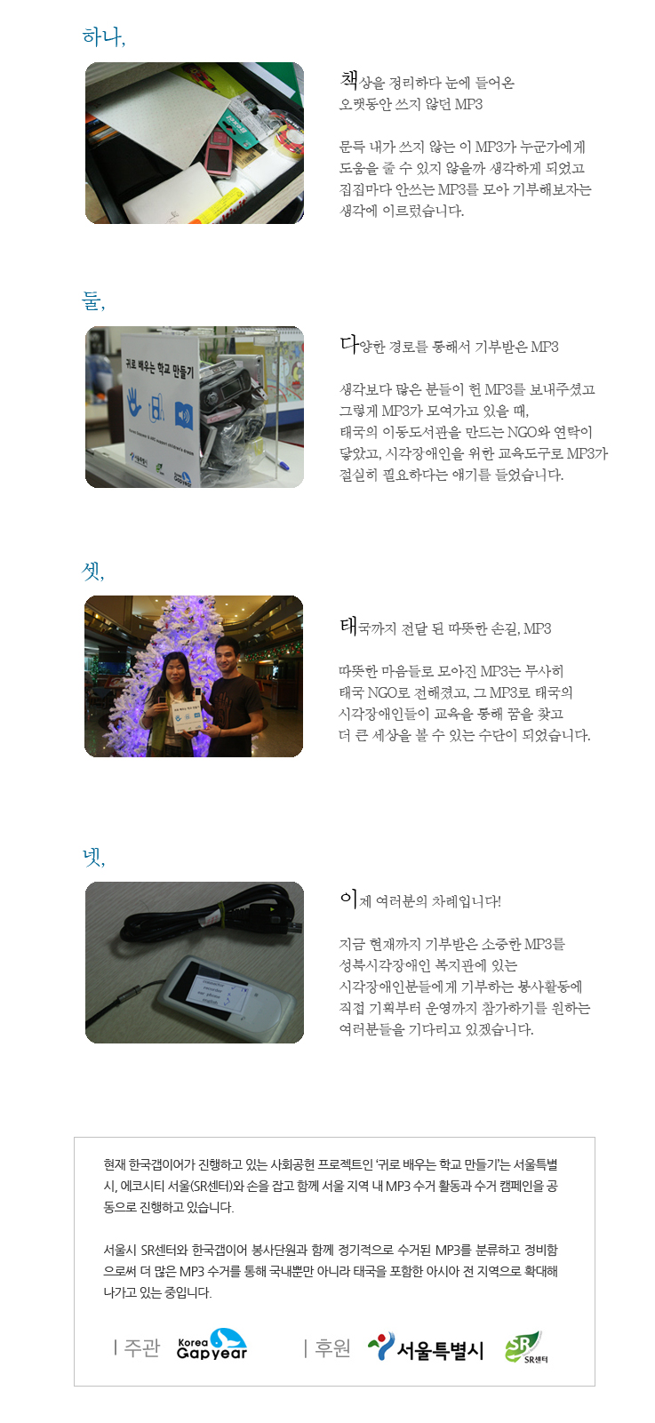 현재 한국갭이어가 진행하고 있는 사회공헌 프로젝트인 ‘귀로 배우는 학교 만들기’는 서울특별 시, 에코시티 서울(SR센터)와 손을 잡고 함께 서울 지역 내 MP3 수거 활동과 수거 캠페인을 공 동으로 진행하고 있습니다. 서울시 SR센터와 한국갭이어 봉사단원과 함께 정기적으로 수거된 MP3를 분류하고 정비함으로써 더 많은 MP3 수거를 통해 국내뿐만 아니라 태국을 포함한 아시아 전 지역으로 확대해 나가고 있는 중입니다.