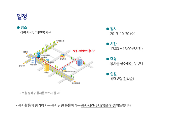 * 봉사활동에 참가하시는 봉사단원 분들에게는 봉사시간(5시간)을 인정해드립니다.