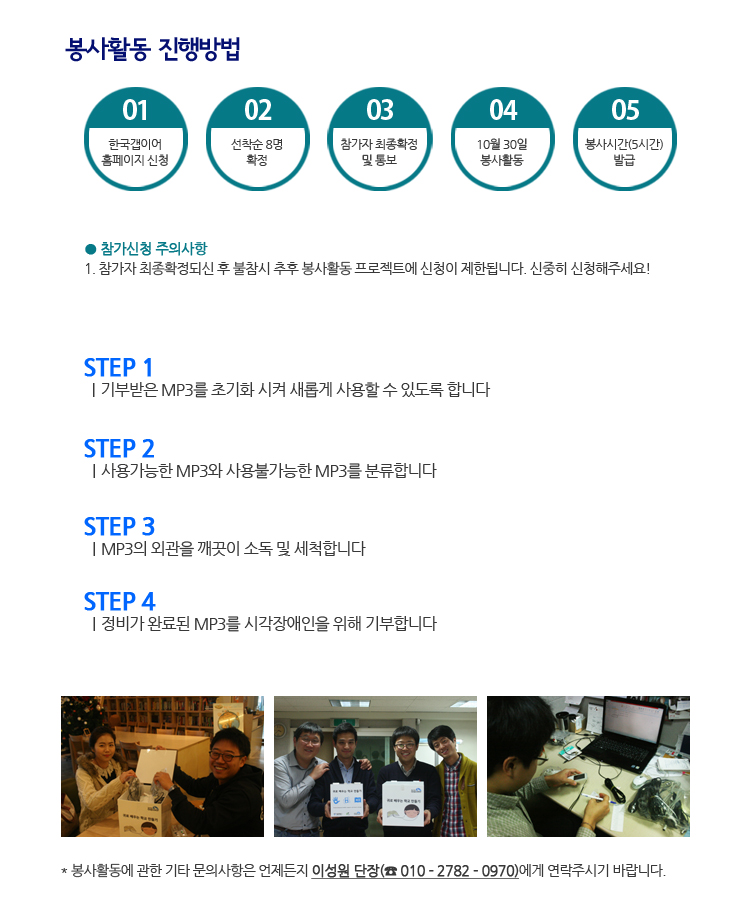 넷, 이제 여러분의 차례입니다! 지금 현재까지 기부 받은 소중한 MP3를 성북시각장애인 복지관에 있는 시각장애인분들에게 기부하는 봉사활동에 직접 기획부터 운영까지 참가하기를 원하는 여러분들을 기다리고 있겠습니다.