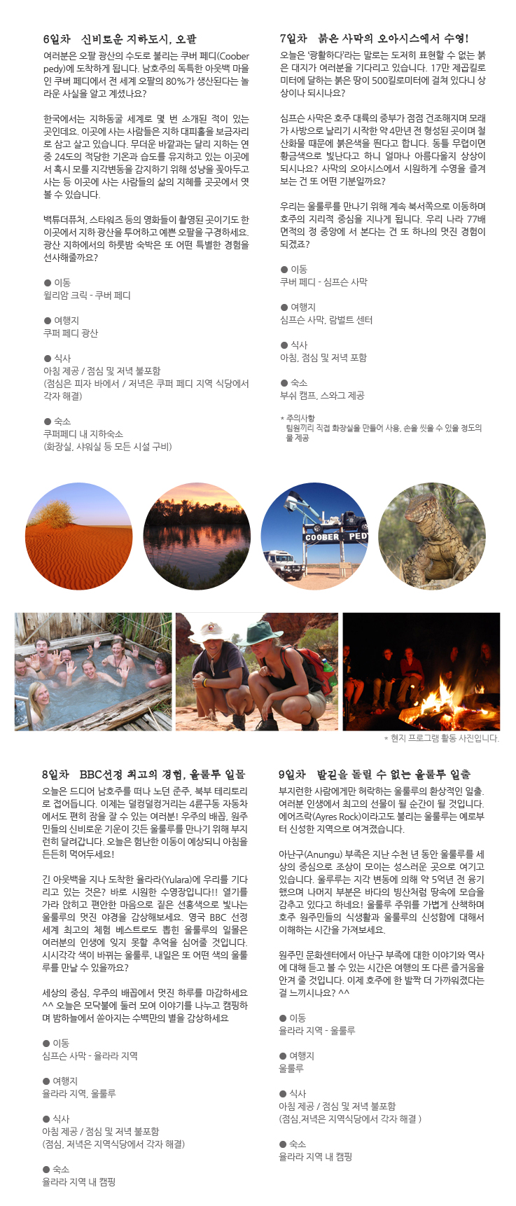 오늘은 드디어 남호주를 떠나 노던 준주, 북부 테리토리로 접어듭니다. 이제는 덜컹덜컹 거리는 4륜구동 자동차 에서도 편히 잠을 잘 수 있는 여러분! 우주의 배꼽, 원주민들의 신비로운 기운이 깃든 울룰루를 만나기 위해 부지런히 달려갑니다. 오늘은 험난한 이동이 예상되니 아침을 든든히 먹어두세요! 긴 아웃백을 지나 도착한 율라라(Yulara)에 우리를 기다리고 있는 것은? 바로 시원한 수영장입니다!! 열기를 가라 앉히고 편안한 마음으로 짙은 선홍색으로 빛나는 울룰루의 멋진 야경을 감상해보세요. 영국 BBC 선정 세계 최고의 체험 베스트로도 뽑힌 울룰루의 일몰은 여러분의 인생에 잊지 못할 추억을 심어줄 것입니다. 시시각각 색이 바뀌는 울룰루, 내일은 또 어떤 색의 울룰루를 만날 수 있을까요? 세상의 중심, 우주의 배꼽에서 멋진 하루를 마감하세요 ^^ 오늘은 모닥불에 둘러 모여 이야기를 나누고 캠핑하며 밤하늘에서 쏟아지는 수백만의 별을 감상하세요 ● 이동 심프슨 사막 - 율라라 지역 ● 여행지 율라라 지역, 울룰루 ● 식사 아침 제공 / 점심 및 저녁 불포함 (점심, 저녁은 지역식당에서 각자 해결) ● 숙소 율라라 지역 내 캠핑