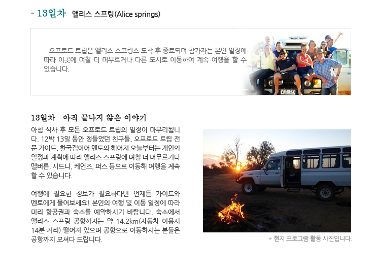 아침 식사 후 모든 오프로드 트립의 일정이 마무리됩니다. 12박 13일 동안 정들었던 친구들, 오프로드 트립 전문 가이드, 한국갭이어 멘토와 헤어져 오늘부터는 개인의 일정과 계획에 따라 앨리스 스프링에 며칠 더 머무르거나 멜버른, 시드니, 케언즈, 퍼스 등으로 이동해 여행을 계속 할 수 있습니다. 여행에 필요한 정보가 필요하다면 언제든 가이드와 멘토에게 물어보세요! 본인의 여행 및 이동 일정에 따라 미리 항공권과 숙소를 예약하시기 바랍니다. 숙소에서 앨리스 스프링 공항까지는 약 14.2km(자동차 이용 시 14분 거리) 떨어져 있으며 공항으로 이동하시는 분들은 공항까지 모셔다 드립니다.