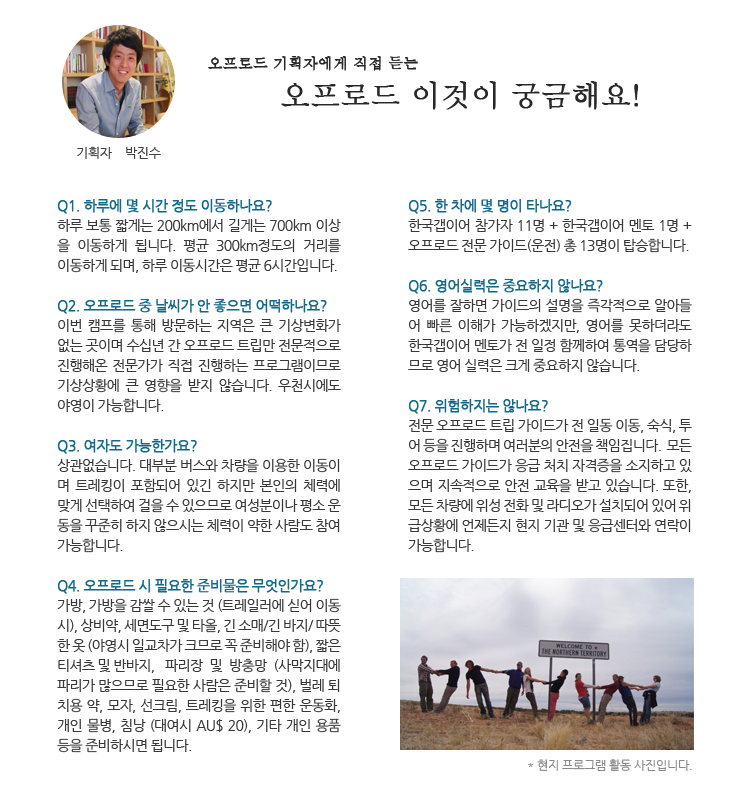 Q1. 하루에 몇 시간 정도 이동하나요? 하루 보통 짧게는 200km에서 길게는 700km 이상을 이동하게 됩니다. 평균 300km정도의 거리를 이동하게 되며, 하루 이동시간은 평균 6시간입니다. Q2. 오프로드 중 날씨가 안 좋으면 어떡하나요? 이번 캠프를 통해 방문하는 지역은 큰 기상변화가 없는 곳이며 수십 년간 오프로드 트립만 전문적으로 진행해온 전문가가 직접 진행하는 프로그램이므로 기상상황에 큰 영향을 받지 않습니다. 우천시에도 야영이 가능합니다. Q3. 여자도 가능한가요? 상관없습니다. 대부분 버스와 차량을 이용한 이동이며 트레킹이 포함되어 있긴 하지만 본인의 체력에 맞게 선택하여 걸을 수 있으므로 여성분이나 평소 운동을 꾸준히 하지 않으시는 체력이 약한 사람도 참여 가능합니다. Q4. 오프로드 시 필요한 준비물은 무엇인가요? 가방, 가방을 감쌀 수 있는 것 (트레일러에 실어 이동 시), 상비약, 세면도구 및 타올, 긴 소매/긴 바지/ 따뜻한 옷 (야영 시 일교차가 크므로 꼭 준비해야 함), 짧은 티셔츠 및 반바지, 파리장 및 방충망 (사막지대에 파리가 많으므로 필요한 사람은 준비할 것), 벌레 퇴치용 약, 모자, 선크림, 트레킹을 위한 편한 운동화, 개인 물병, 침낭 (대여시 AU$ 20), 기타 개인 용품 등을 준비하시면 됩니다.Q5. 한 차에 몇 명이 타나요? 한국갭이어 참가자 11명 + 한국갭이어 멘토 1명 + 오프로드 전문 가이드(운전) 총 13명이 탑승합니다. Q6. 영어실력은 중요하지 않나요? 영어를 잘하면 가이드의 설명을 즉각적으로 알아들어 빠른 이해가 가능하겠지만, 영어를 못하더라도 한국갭이어 멘토가 전 일정 함께하여 통역을 담당하므로 영어 실력은 크게 중요하지 않습니다. Q7. 위험하지는 않나요? 전문 오프로드 트립 가이드가 전 일동 이동, 숙식, 투어 등을 진행하며 여러분의 안전을 책임집니다. 모든 오프로드 가이드가 응급 처치 자격증을 소지하고 있으며 지속적으로 안전 교육을 받고 있습니다. 또한, 모든 차량에 위성 전화 및 라디오가 설치되어 있어 위급상황에 언제든지 현지 기관 및 응급센터와 연락이 가능합니다.