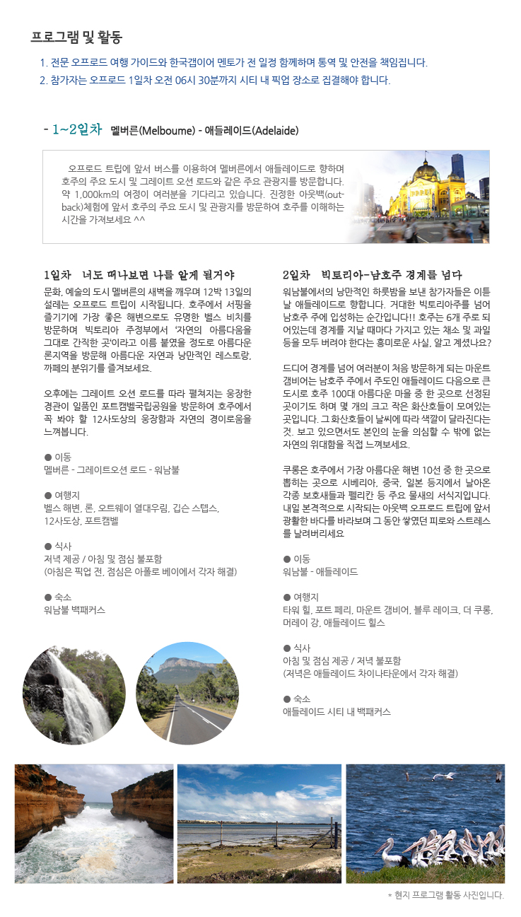 오프로드 트립에 앞서 버스를 이용하여 멜버른에서 애들레이드로 향하며 호주의 주요 도시 및 그레이트 오션 로드와 같은 주요 관광지를 방문합니다. 약 1,000km의 여정이 여러분을 기다리고 있습니다. 진정한 아웃백(out- back)체험에 앞서 호주의 주요 도시 및 관광지를 방문하여 호주를 이해하는 시간을 가져보세요 ^^