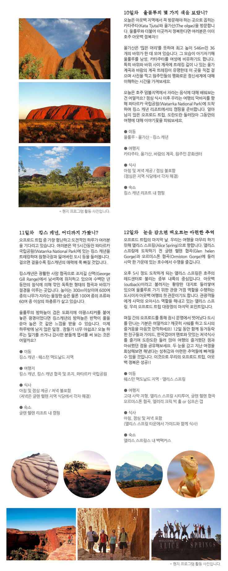단체1989년부터 ‘The original and still the best!’ 라는 슬로건 아래 호주 방문자들에게 진정한 호주의 아웃백을 느낄 수 있도록 4륜 자동차여행, 호주 원주민 문화 체험, 울룰루, 카타 추타, 킹스 캐년 등과 같은 오프로드 트립 프로그램을 제공하며 평생 잊지 못할 모험과 추억을 제공하는 곳입니다. 매년 호주의 진정한 아웃백을 경험하기 위해 모여드는 참가자들로 인해 언제나 활기로 가득 찬 곳입니다. 일반 적으로 버스를 이용한 투어를 제공하는 곳과는 달리 설립 이래 4륜 자동차를 이용한 진정한 아웃백 경험을 제공하는 유일한 곳으로 호주 관광청으로부터 여러 해 수상한 바 있습니다. 단순한 사막 여행이 아니라 참가자들이 현지 원주민과 지역사회를 이해하고 피부로 직접 느낄 수 있도록 프로그램을 진행하고 있으며 자연 보호에도 앞장서고 있습니다. 아웃백에 대한 열정과 자격을 갖춘 친절하고 유머러스한 전문 오프로드 트립 가이드가 전 일정 동행 하여 참가자들의 안전을 책임지며 지역 문화와 원주민 들의 삶, 유럽인들의 이주 역사 등에 대한 이해도를 높여 줍니다. * 안전사항 - 모든 차량에 위성 전화 설치 - 모든 차량 UHF(극초단파) 아웃백 라디오 설치 - 모든 가이드 응급 처치 자격 소지