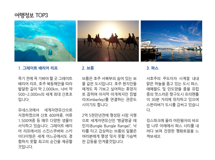 죽기 전에 꼭 가봐야 할 곳 그레이트 배리어 리프, 호주 북동해안을 따라 발달한 길이 약 2,000km, 너비 약 500~2,000m의 세계 최대 산호초 입니다. 유네스코에서 세계자연유산으로 지정하였으며 산호 400여종, 어류 1,500여종 등 매우 다양한 생물이 서식하고 있습니다. 그레이트 배리어 리프에서의 스킨스쿠버와 스카이다이빙은 세계 어느 곳에서도 경험하지 못할 최고의 순간을 제공할 것입니다.
