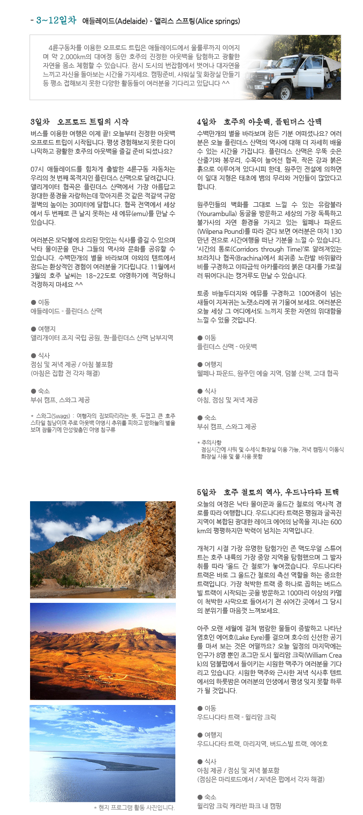 버스를 이용한 여행은 이제 끝! 오늘부터 진정한 아웃백 오프로드 트립이 시작됩니다. 평생 경험해보지 못한 다이나믹하고 광활한 호주의 아웃백을 즐길 준비 되셨나요? 07시 애들레이드를 힘차게 출발한 4륜구동 자동차는 우리의 첫 번째 목적지인 플린더스 산맥으로 달려갑니다. 앨리게이터 협곡은 플린더스 산맥에서 가장 아름답고 장대한 풍경을 자랑하는데 깎아지른 것 같은 적갈색 규암 절벽의 높이는 30미터에 달합니다. 협곡 전역에서 세상에서 두 번째로 큰 날지 못하는 새 에뮤(emu)를 만날 수 있습니다. 여러분은 모닥불에 요리된 맛있는 식사를 즐길 수 있으며 낙타 몰이꾼을 만나 그들의 역사와 문화를 공유할 수 있습니다. 수백만 개의 별을 바라보며 야외의 텐트에서 잠드는 환상적인 경험이 여러분을 기다립니다. 11월에서 3월의 호주 날씨는 18~22도로 야영하기에 적당하니 걱정하지 마세요 ^^ ● 이동 애들레이드 - 플린더스 산맥 ● 여행지 앨리개이터 조지 국립 공원, 퀀-플린더스 산맥 남부지역 ● 식사 점심 및 저녁 제공 / 아침 불포함 (아침은 집합 전 각자 해결) ● 숙소 부쉬 캠프, 스와그 제공 * 스와그(Swags) : 여행자의 짐보따리라는 뜻, 두껍고 큰 호주 스타일 침낭이며 주로 아웃백 야영시 추위를 피하고 밤하늘의 별을 보며 잠들기에 안성맞춤인 야영 침구류