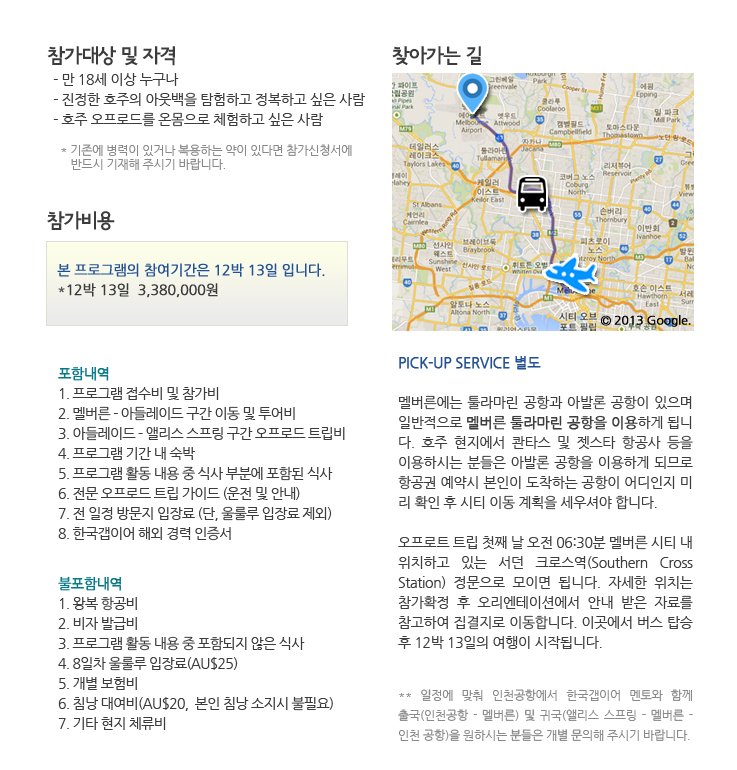 - 만 18세 이상 누구나 - 진정한 호주의 아웃백을 탐험하고 정복하고 싶은 사람 - 호주 오프로드를 온몸으로 체험하고 싶은 사람 * 기존에 병력이 있거나 복용하는 약이 있다면 참가신청서에 반드시 기재해 주시기 바랍니다.