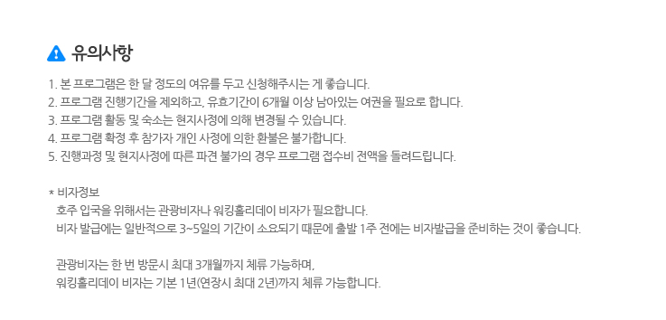 * 비자정보 호주 입국을 위해서는 관광비자나 워킹홀리데이 비자가 필요합니다. 비자 발급에는 일반적으로 3~5일의 기간이 소요되기 때문에 출발 1주 전에는 비자발급을 준비하는 것이 좋습니다. 관광비자는 한 번 방문시 최대 3개월까지 체류 가능하며, 워킹홀리데이 비자는 기본 1년(연장시 최대 2년)까지 체류 가능합니다.