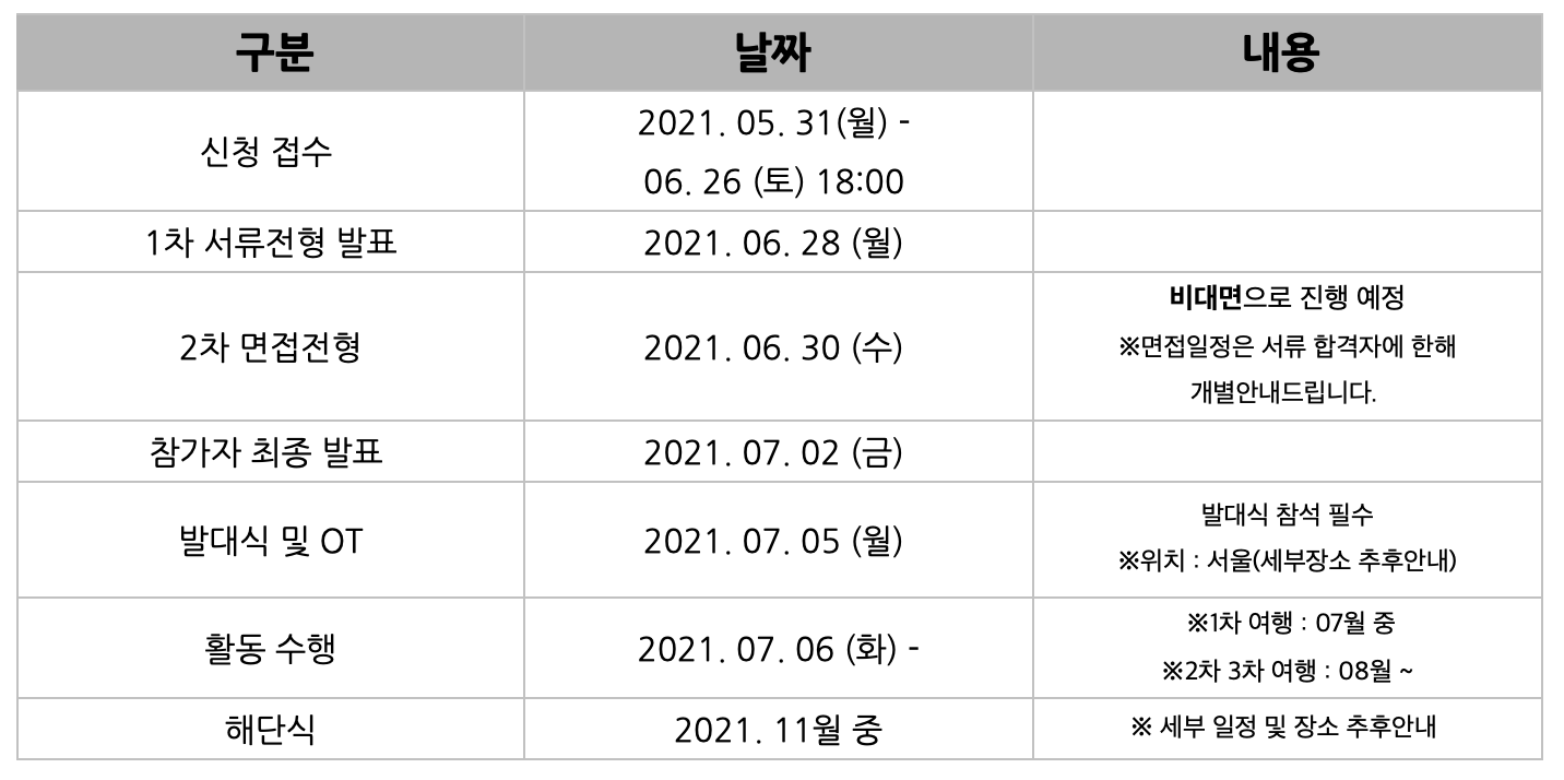 코로나19가 지속될 경우 발대식 및 OT 등의 단체 행사는 비대면 또는 각 팀별 미팅으로 대체되어 진행될 수 있습니다.