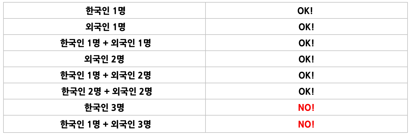 * 팀 참가시 최대 4인으로 구성할 수 있으며, 팀별 한국인 2명, 외국인 2명 초과는 불가능합니다.