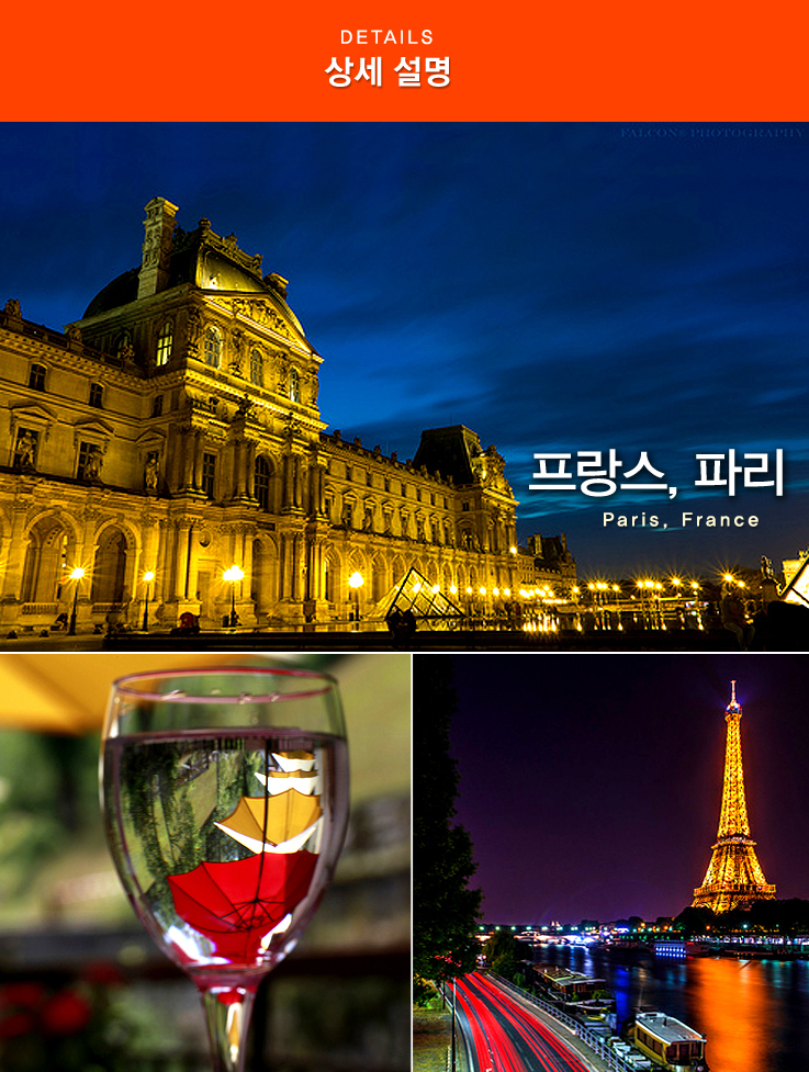 유럽대륙의 서부, 지중해와 대서양 사이에 위치한 프랑스의 수도 파리. 프랑스의 정치, 경제, 교통, 학술, 문화의 중심지이면서도 세계 문화의 중심지라 할 수 있는 곳입니다. 세계 제일을 자랑하는 루브르 박물관을 필두로 수 많은 미술관과 박물관이 있고 프랑스의 역사, 문화, 예술의 사적 건축물들을 자랑하는 도시입니다.