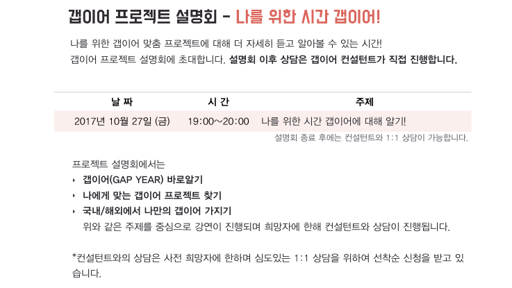 나를 위한 시간 갭이어! - 10월 27일 갭이어 프로젝트 설명회 (선착순 마감)