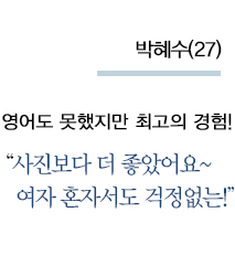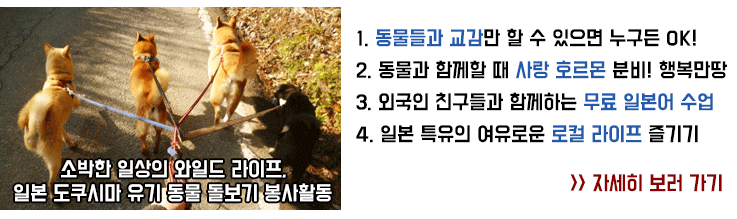 " 동물들을 좋아하지만 반려동물을 키울 환경은 되지 못해서 항상 아쉬워했었고, 한국에서도 유기동물 봉사활동을 하고 싶다고 생각을 종종 하고 있었지만 실천에는 옮기지 못하고 있었습니다. 낮 동안은 프로젝트에 참가하고, 저녁시간이나 주말에는 자유롭게 시간을 보낼 수 있다는 점도 매력적이었고 일본여행도 할 수 있을 것 같아서 설레는 마음으로 신청했던 거 같습니다. 물론 일본이라서 가깝고, 프로젝트의 기간과 경비가 저의 조건과 잘 맞았던 점도 있습니다." ▶︎ 김지영 참가자 전체 후기 보러가기 (클릭)