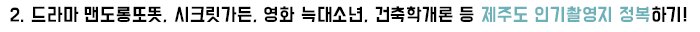 영화나 드라마에서 자주 등장하는 제주도! 그래서 제주도 곳곳에는 드라마나 영화촬영지가 그대로 보존되어 있는 곳들이 많이 있기 때문에 직접 이 곳을 방문해서 영화나 드라마 주인공처럼 인증샷을 남겨보세요! 또한 빅뱅의 GD가 운영하는 카페도 제주도의 명소 중 하나입니다. 내가 좋아하는 드라마나 영화, 가수의 발자취를 따라 제주도를 여행해보는건 어떤가요?