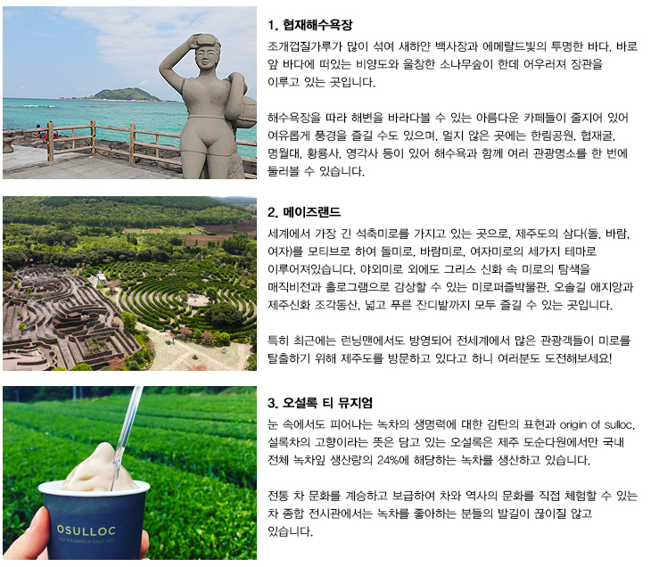 더욱이 제주 곳곳의 자연 문화유산은 학술, 문화, 관광, 생태, 역사 등 여러 분야에서 중요한 가치가 있다고 인정받아 세계자연유산에 등록되며 많은 외국인들도 제주도를 방문하고 있습니다. 자연과 어우러진 여유로움이 가득한 제주도에서 여러분만의 특별한 시간을 만들어 보세요!!