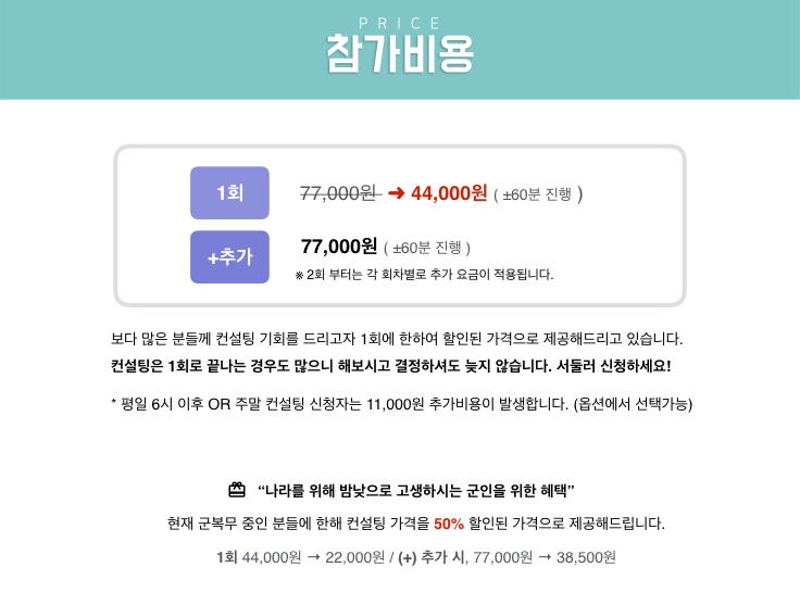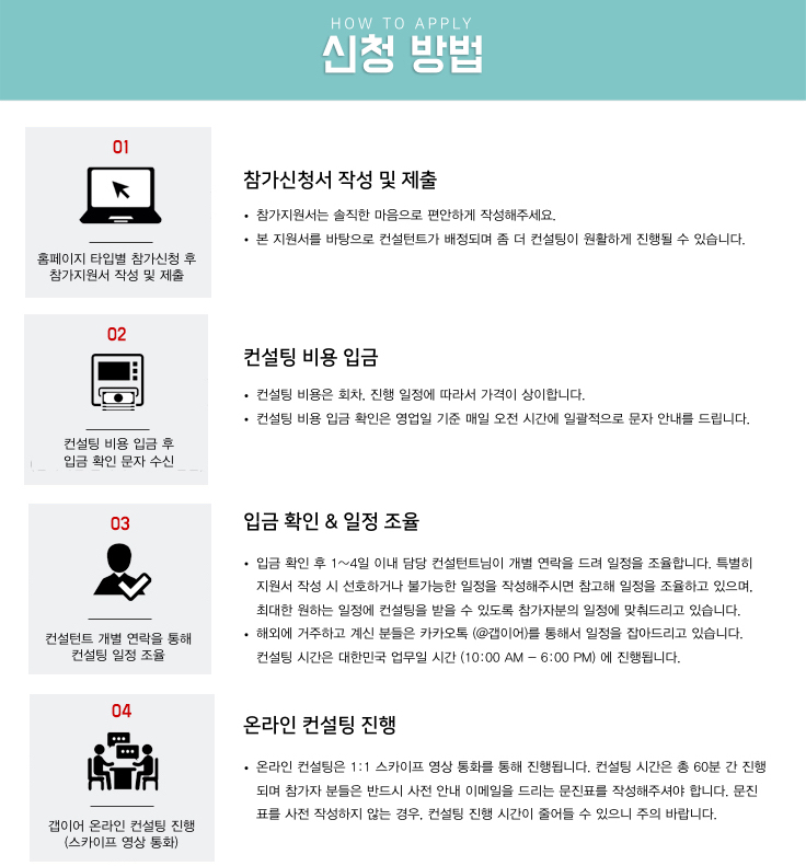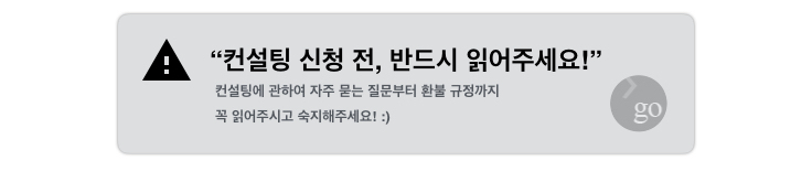 * 60분 내외 컨설팅 문진표를 컨설팅 전 미리 작성 후 제출. 실제 컨설턴트와의 컨설팅 시간은 동일 |