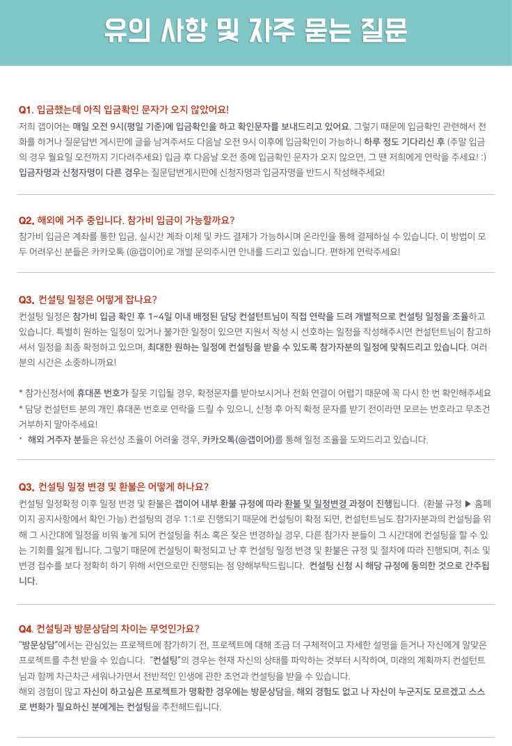 3. 컨설팅 일정 변경은 컨설팅 예약일 3일 이전의 경우 1회에 한해 가능합니다. 한국갭이어 귀책 사유 및 컨설턴트님의 사정에 따른 진행 불가 및 진행 중단 시 컨설팅이 진행되지 않은 횟수를 계산하여 환불처리 됩니다.