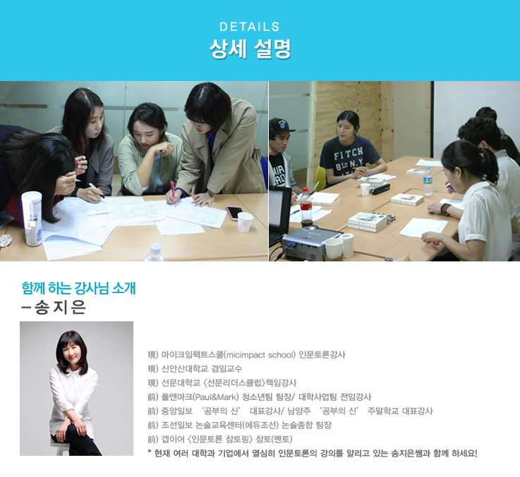인문학은 문과적 학문도, 보여주는 교양을 쌓기 위한 도구도 아닙니다. 토론 역시 특별한 사람들만 해야 하는 까다롭고 어려운 것이 아니구요. 이 두 가지는 함께 갈 때 시너지가 생깁니다. 인문학이 깊이 있는 ‘내용’을 가져다 준다면, 토론은 이 안에 있는 삶의 철학들을 보다 잘 이해하고 전달하게 하는 ‘방법’을 담당하기 때문입니다. 본 강의는 인문토론을 통해 복잡다단한 현대사회에 꼭 필요한 통찰력과 판단력을 갖도록 하고, 그것을 삶에 직접 적용할 수 있도록 하는 ‘실용적’ 목표를 추구합니다.