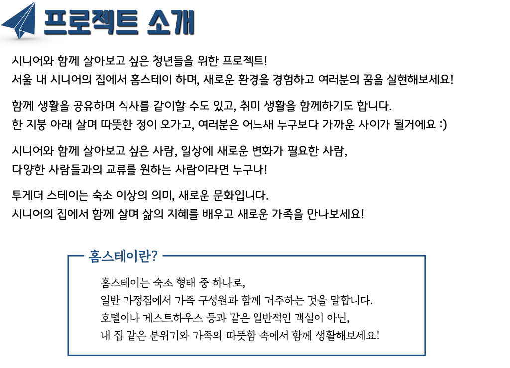 시니어와 함께 살아보고 싶은 청년들을 위한 프로젝트! 서울 내 시니어의 집에서 홈스테이 하며, 새로운 환경을 경험하고 여러분의 꿈을 실현해보세요!