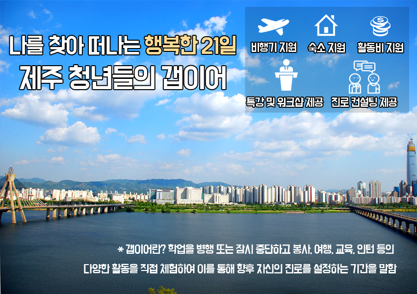 이번 여름에는 제주도를 떠나 서울에서 최고로 핫한 홍대에서 약 한 달 동안 살면서 갭이어를 가져 보시는 건 어떠세요? 늘 새로운 도전과 배움을 갈망하고 있는 제주 청년 모두 모여라~!! 다양한 경험을 통해 진정한 나 자신을 발견하고 삶의 방향을 설정할 수 있는 절호의 찬스입니다. 지방자치단체 최초 갭이어 프로젝트! 지금 바로 신청하세요:)