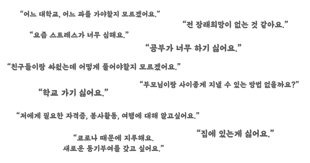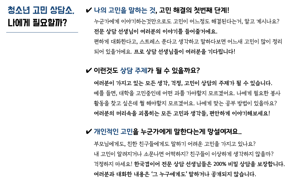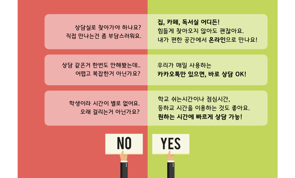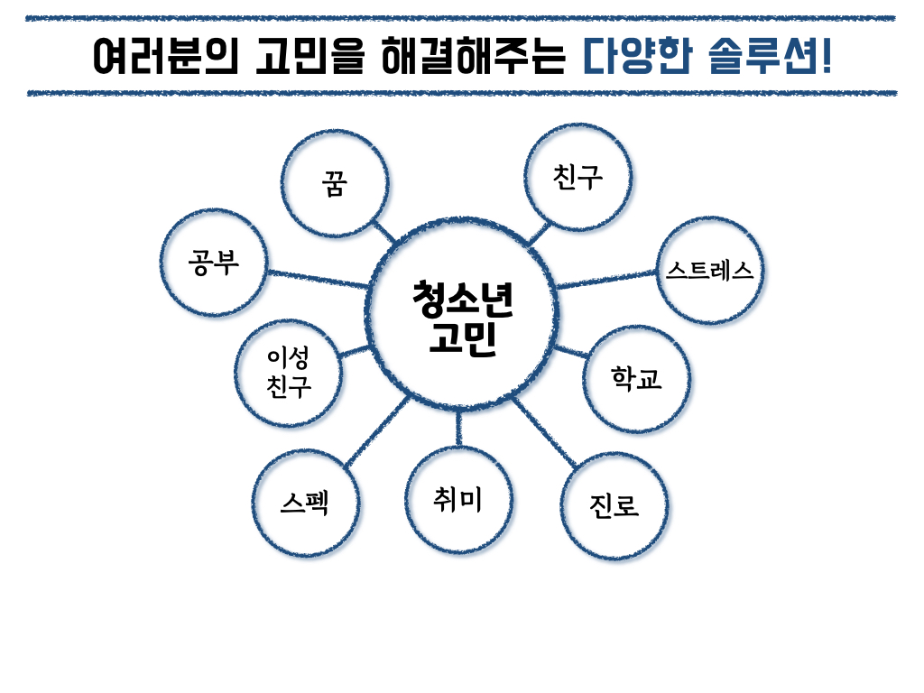 여러분의 고민을 들어주고 해결해줄, 전문 상담 선생님이 기다리고 있습니다 :)