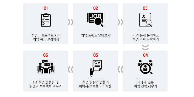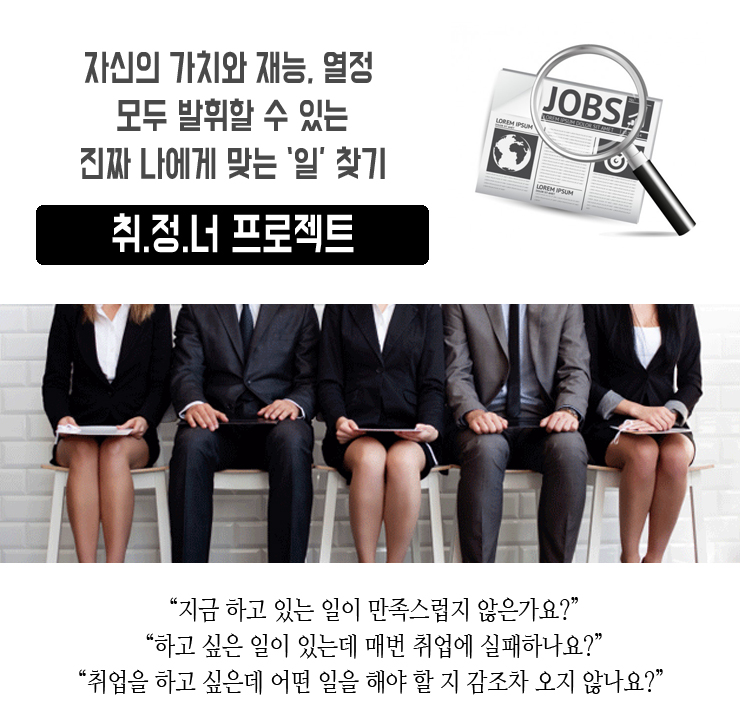 <취정너 프로젝트>는 내가 원하는 직업의 의미를 정확하게 정의하고 최신 취업 트렌드와 나의 취업문제 분석을 통해 실현 가능한 취업 목표와 방향을 설정 합니다. 취업의 성공률을 높이기 위해 나에게 맞는 취업 전략과 계획을 구상하고 스토리텔링과 인포그래픽을 활용한 효과적인 이력서와 비전포트폴리오를 완성 시킵니다. 완성된 이력서와 비전포트폴리오는 1:1 컨설팅을 통해 평가되고 다듬어져 취업 목표를 달성하는 강력한 나만의 무기가 됩니다.