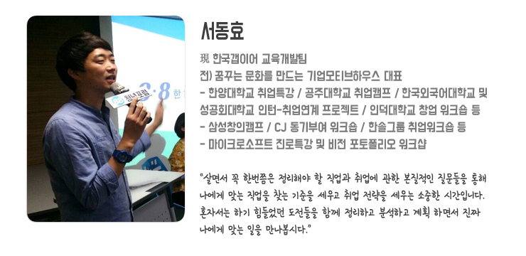 3. 단순히 대기업 취업을 위해 자기소개서, 면접 등의 비법이나 스킬만을 알고 싶으신 분들은 프로젝트 신청을 지양해주시기 바랍니다. 수업 내용 중 이력서와 포토폴리오를 만드는 과정이 있으나 이는 자신을 파악한 후 자신이 원하는 직종을 찾아가는 과정 중 일부이며 취업 비법이나 스킬이 주 강의내용은 아닙니다.